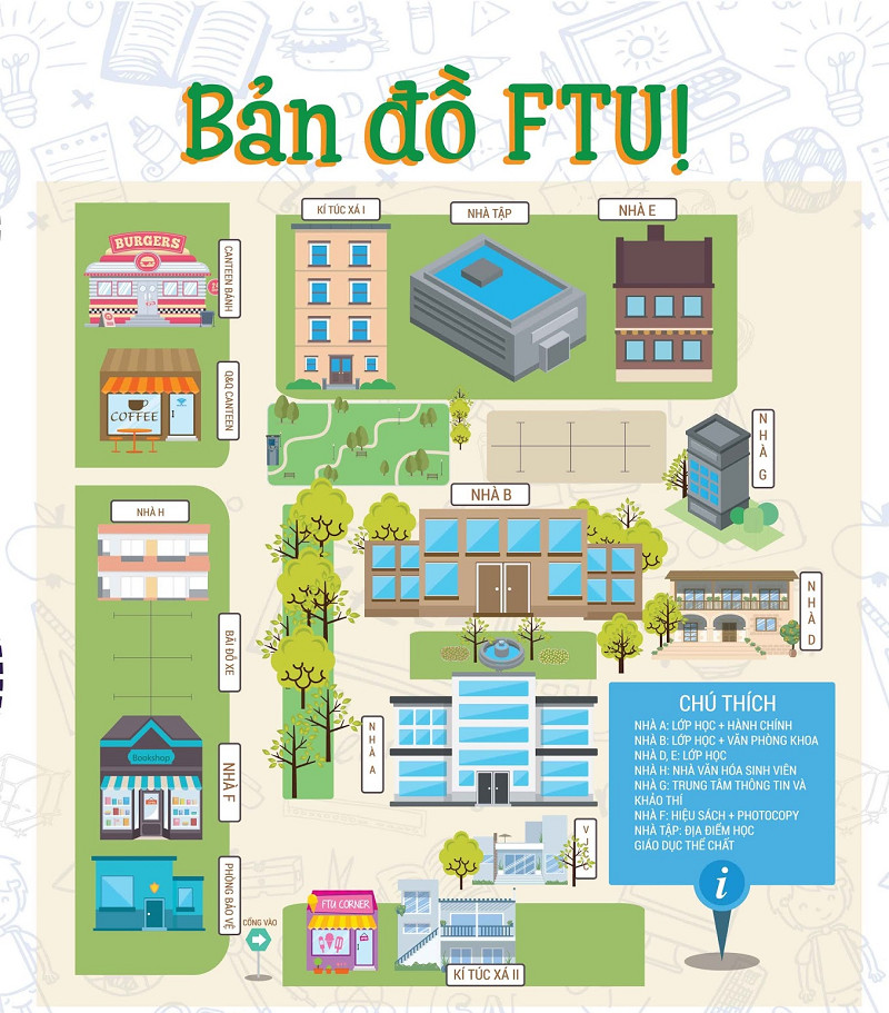 Bản đồ FTU thể hiện toàn bộ khuôn viên trường với các khu vực chính như: