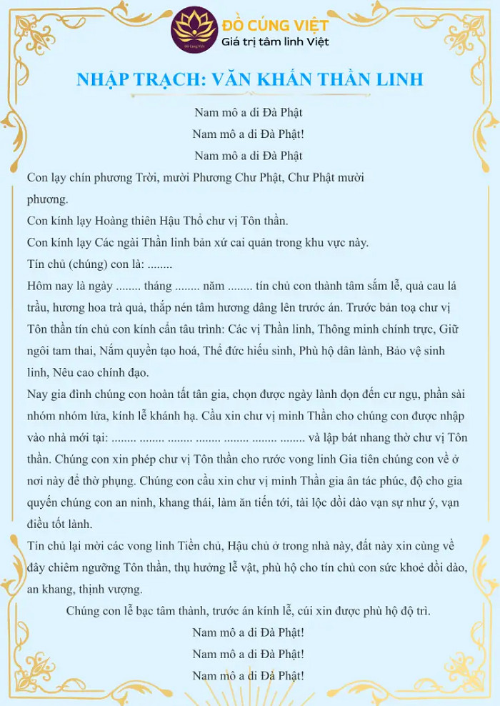 Chúng con kính cáo chư vị Thần linh, Thổ địa… nay gia đình con chuyển đến đây ở, xin phép được cư ngụ, phù hộ độ trì cho gia đình con mạnh khỏe, bình an, làm ăn phát đạt, tài lộc dồi dào…