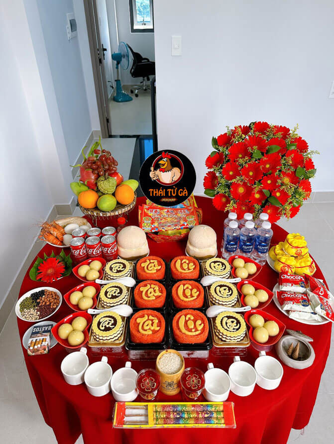 - Mâm mặn (hoặc chay nếu theo đạo): Gà luộc nguyên con (hoặc chân giò/heo quay), xôi (gấc hoặc trắng), tam sên (thịt luộc, tôm luộc, trứng luộc), chè, bánh chưng/bánh tét.