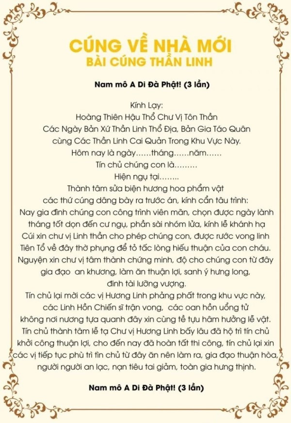 Nam mô A Di Đà Phật! (3 lần) Con kính lạy Tổ tiên nội ngoại họ… Hôm nay… ngày lành tháng tốt, gia đình con đã dọn về nhà mới tại… Nhờ hồng phúc tổ tiên, chúng con thành tâm sắm lễ, hương hoa trà quả dâng lên trước án. Xin rước ông bà về thờ cúng, phù hộ độ trì cho con cháu bình an, tài lộc…