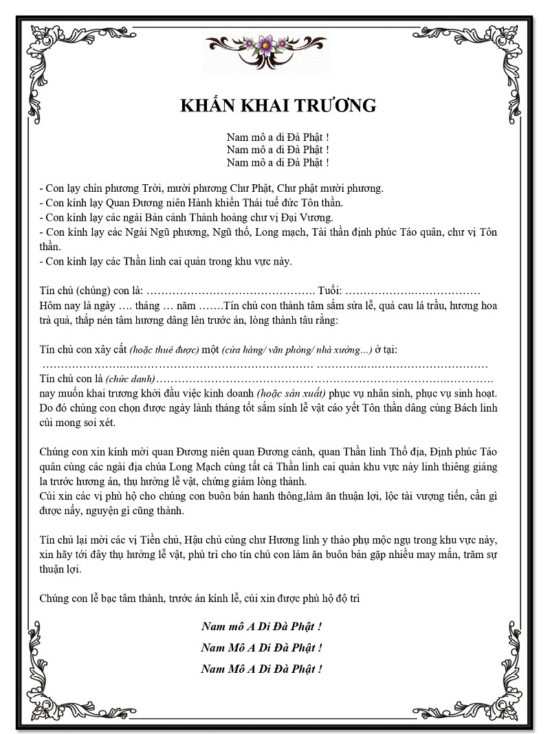 Chúng con kính cáo chư vị Thần linh, Thổ địa… nay công ty/cửa hàng chúng con chính thức khai trương khởi đầu việc kinh doanh tại xứ này (địa chỉ cửa hàng/văn phòng…).