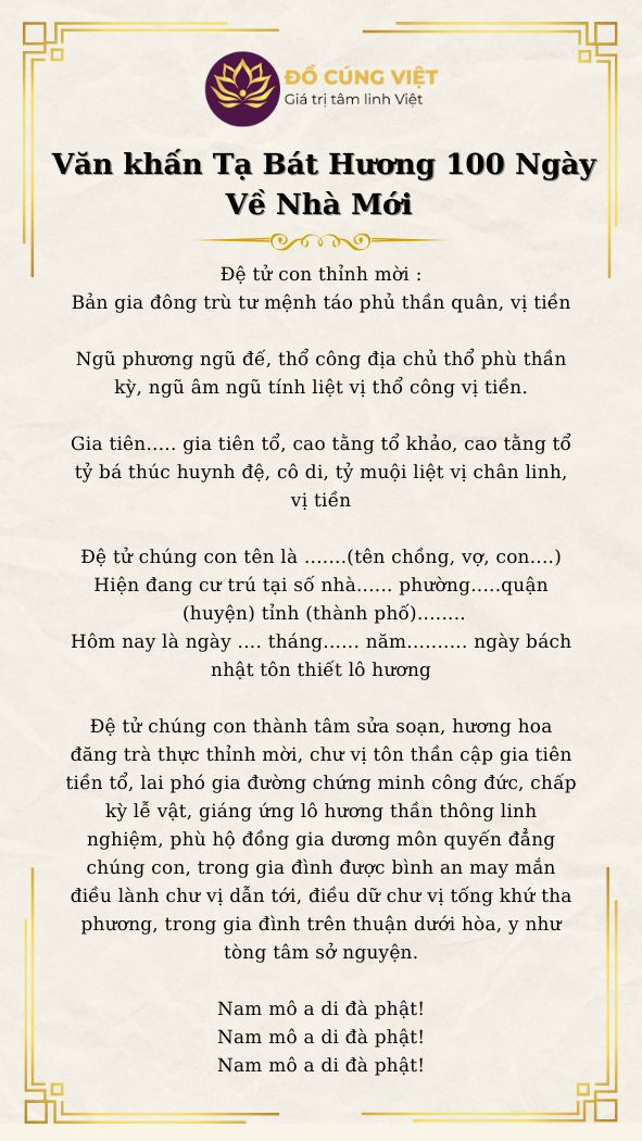 Hôm nay ngày… tháng… năm Bính Ngọ 2026 (âm lịch), nhân ngày tròn 100 ngày kể từ khi an vị bát hương tại nhà mới, tín chủ con là… (họ tên), cùng gia quyến…